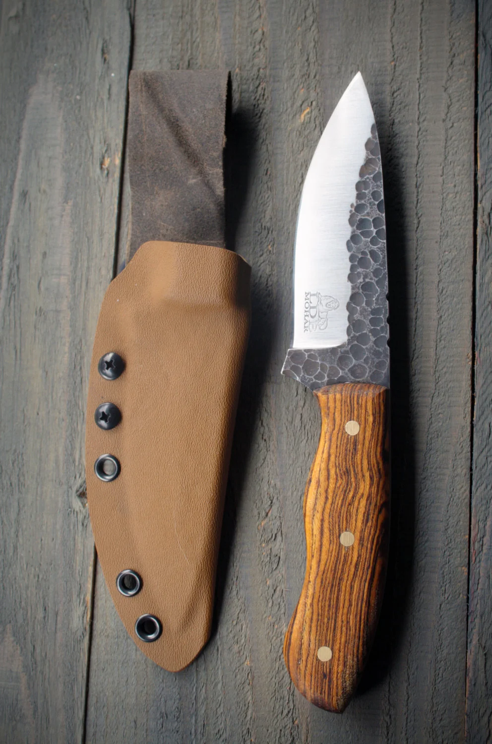 This bush knife is made to be great for all-around camping, hunting, and wilderness survival. It is made from a high carbon 1095 steel, and will keep a very durable and keen edge. It has a 4" cutting edge, and is 9" overall. A custom-fit kydex/leather sheath is included for comfortable and safe carrying.