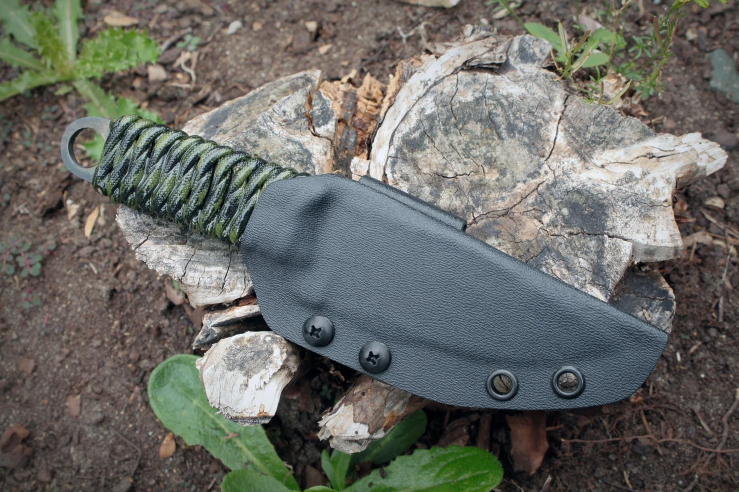 This is a 550 Paracord wrapped EDC knife. It is 7.25" oal, with a 3.5" blade. It features a forge-hammered finish, and a resin-hardened paracord wrap in the color of your choice (Please specify in order notes). Horizontal carry custom-fit kydex sheath included.