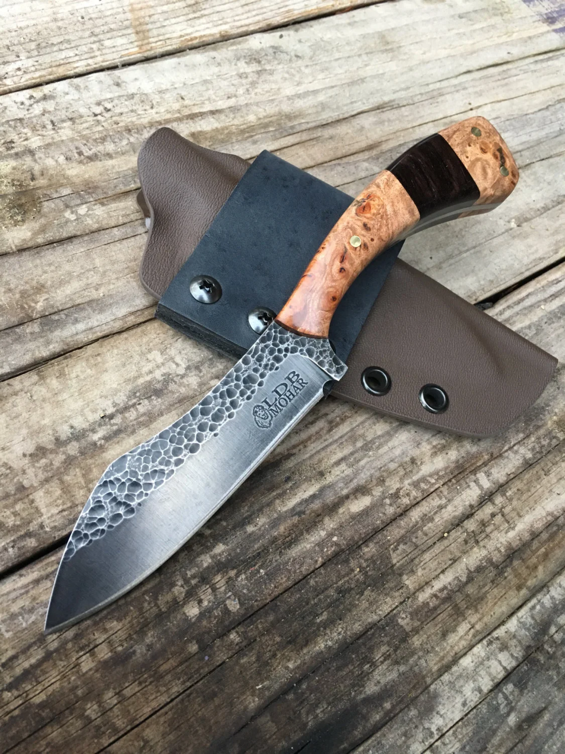 This is a custom Sheepfoot blade. The knife measures approx. 7.5" overall with a 3.5" blade. . Your choice of high carbon 1095 steel, high carbon Damascus steel, or S35VN stainless steel. The knife comes with a custom fit Kydex sheath for safe and comfortable carry.